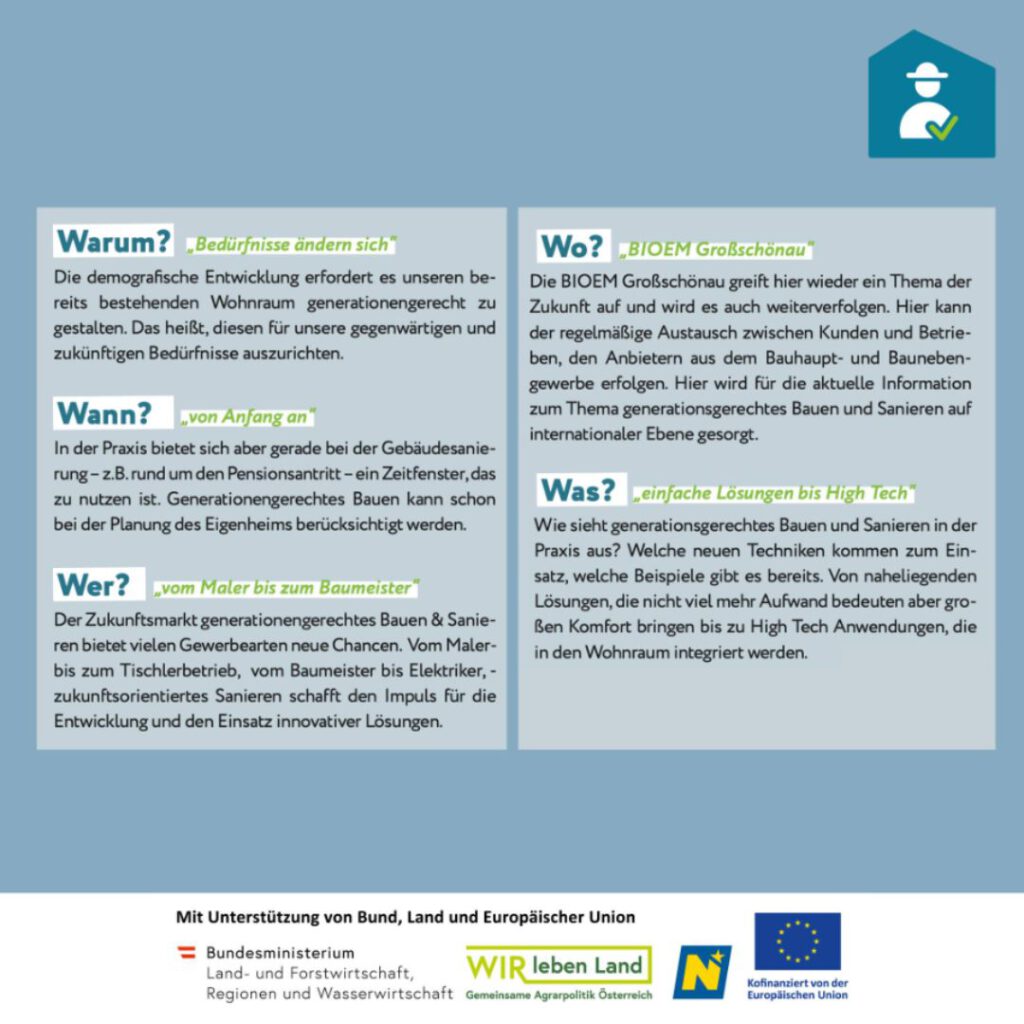 Die bevorstehende BIOEM 2025 bietet die Möglichkeit, sich mit generationengerechtem Bauen und Sanieren auseinanderzusetzen. Besucherinnen und Besucher können sich über praktische Lösungen, Wohnkonzepte und Unterstützungsangebote informieren und Anregungen für das eigene Zuhause gewinnen.